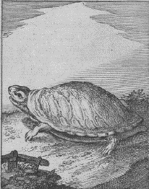 IV. Doe alle beesten van Iupiter te gast ghenoodt (= uitgenodigd) waren, soo heeft hem de Schildt-padt alleene achter ghehouden; ende is niet ter Feeste ghekomen: Iupiter verwondert, soude gheerne de oorsaeck daar af weten, liet hem vraghen; waerom hy niet ghekomen was in soo goeden grooten geselschap, die van den oppersten God gheroepen waren. Antwoorde: Waer over hy verwesen worde in den hooghen Raedt der Goden, altijdt zijn huys voor hem te draghen, ende by zijn leven daer niet uyt te gaen.