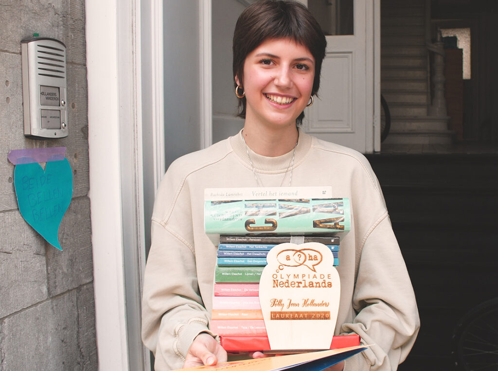 Polly Jean Hollanders, laatstejaars van het Pius X Instituut in Antwerpen, won de eerste editie van de Olympiade Nederlands met haar onderzoek naar de oorsprong van dt-fouten. Ze speurde in haar eigen chatgeschiedenis naar fouten en analyseerde die door inzichten uit de psycholinguïstiek, de taalkunde en de statistiek te combineren. De jury prees haar “voortreffelijke wetenschappelijke inzicht, grote welbespraaktheid en aanstekelijke zin voor humor”.